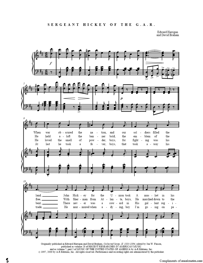 When war obscured the nation, and our soldiers filled the land, John Hickey for the Union took a musket in his hand; So faithfully and nobly boys, He followed Stripes and Stars, Courageous Irish trooper in the ranks of the G.A.R. |