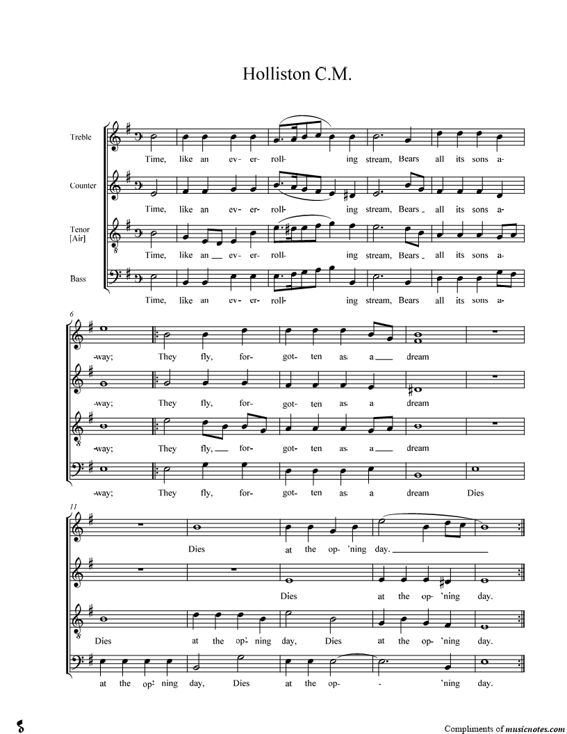 Time, like an everrolling stream, Bears all its sons away; They fly, forgotten as a dream Dies at the op'ning day. |