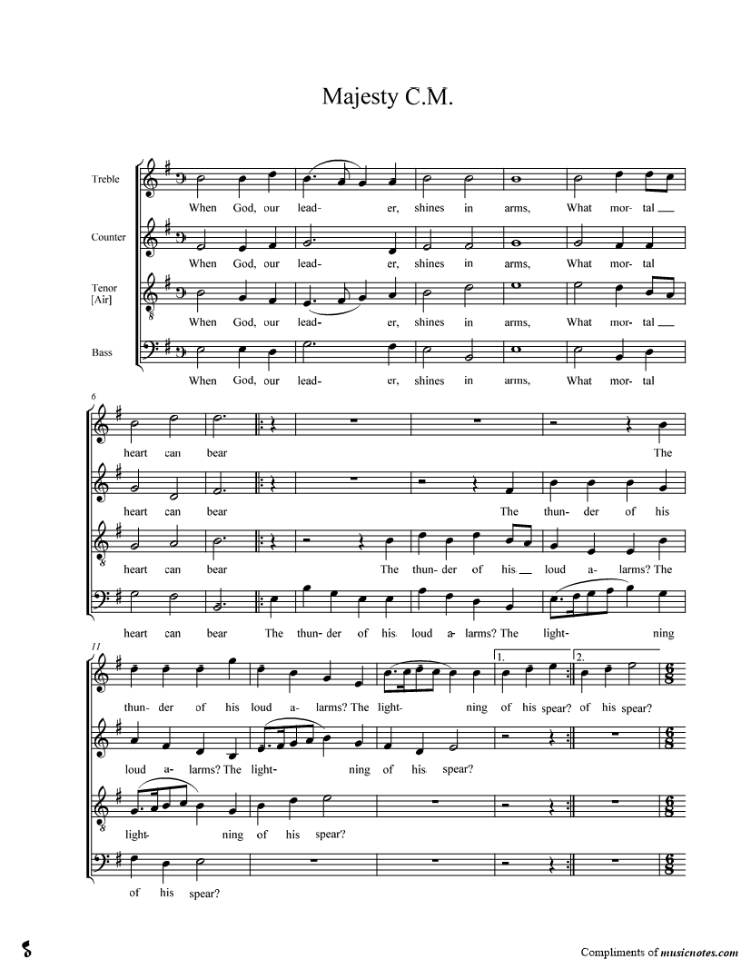 When God, our leader, shines in arms, What mortal heart can bear The thunder of his loud alarms? |