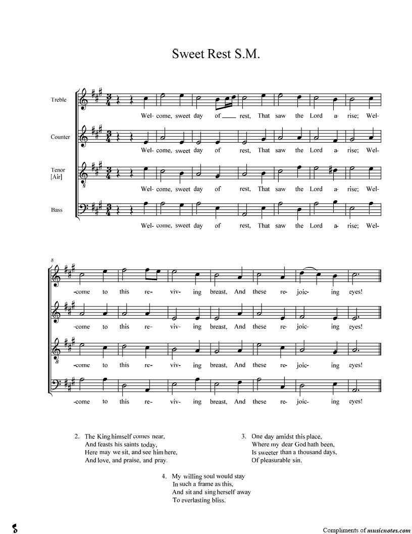 Welcome, sweet day of rest, That saw the Lord arise; Welcome to this reviving breast, And these rejoicing eyes! |