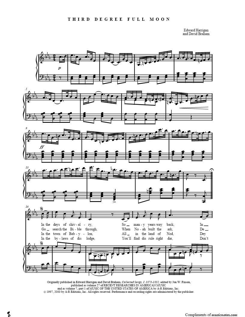 In the days of chivalry, So many years way back, In all de mighty tournaments, De warriors was black; When dis order was laid out, And the darkies' greatest boon Was to be a gallant knight, sir, in The third degree full moon. |