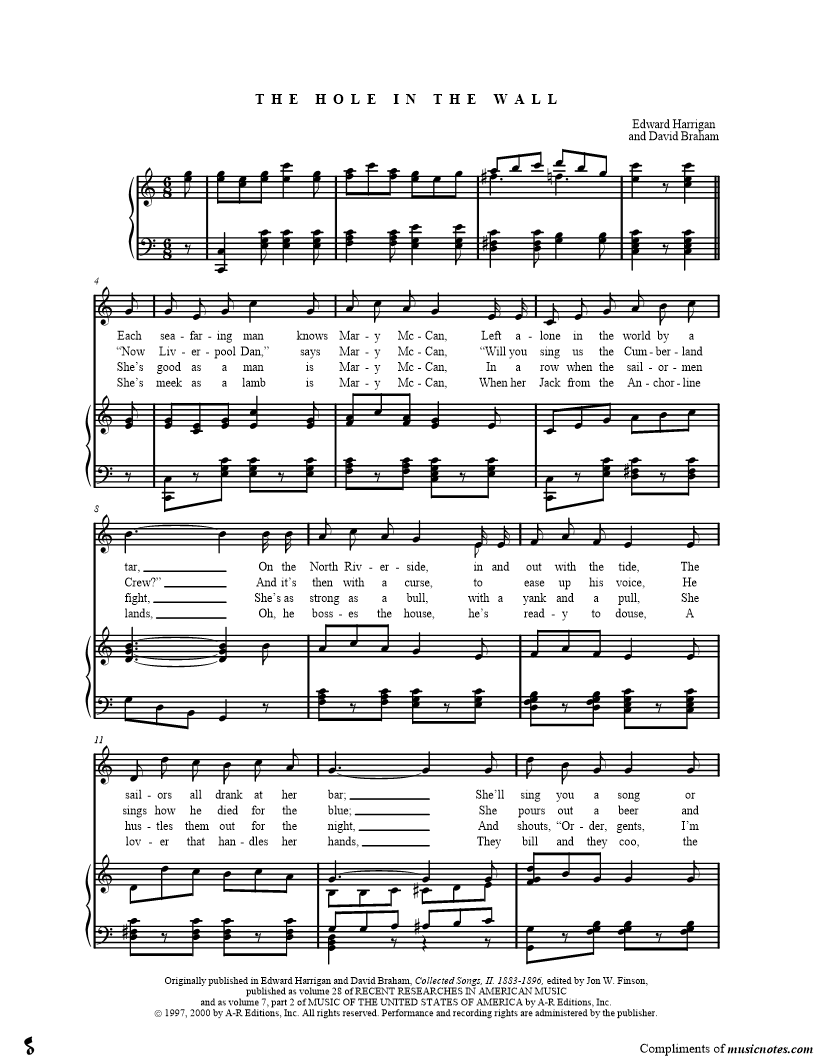 Each seafaring man knows Mary McCan, Left alone in the world by a tar, On the North Riverside, in and out with the tide, The sailors all drank at her bar; She'll sing you a song or help one along, On Saturday night there's a call, For music and joke, with whiskey and smoke, Go down to the Hole in the Wall. |