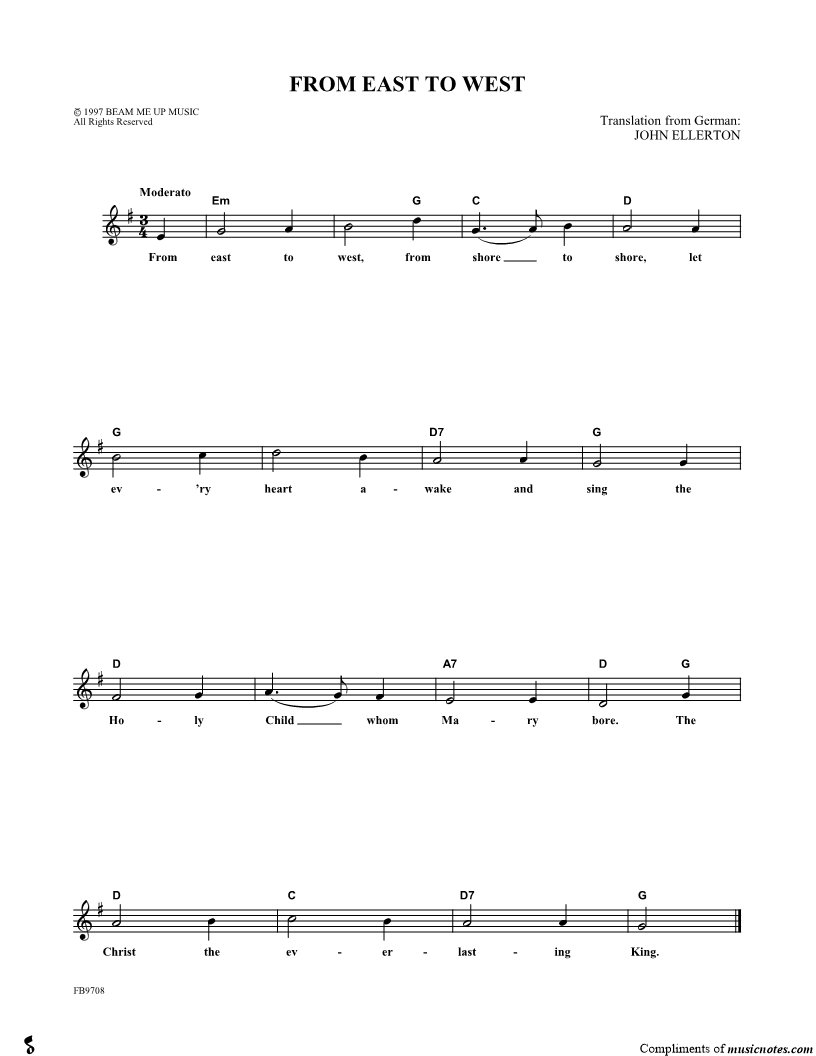 From east to west, from shore to shore, let ev'ry heart awake and sing the Holy Child whom Mary bore. |