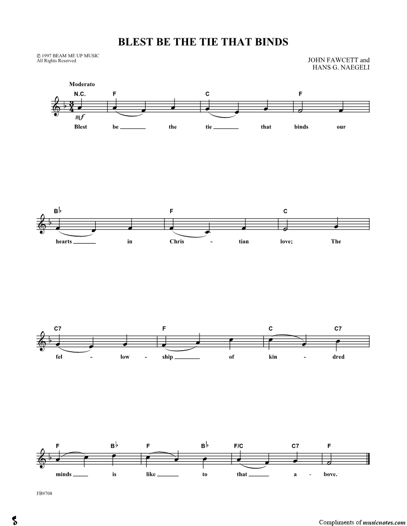 Blest be the tie that binds our hearts in Christian love; The fellowship of kindred minds is like to that above. |