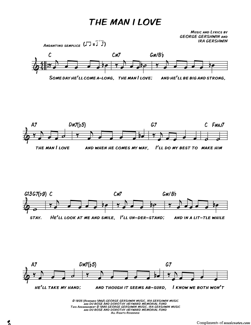 Some day he'll come along, the man I love; and he'll be big and strong, the man I love and when he comes my way, I'll do my best to make him stay. |