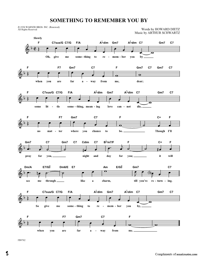 Oh, give me something to remember you by \t when you are far away from me, dear; some little something, meaning love cannot die, \t no matter where you chance to be. |