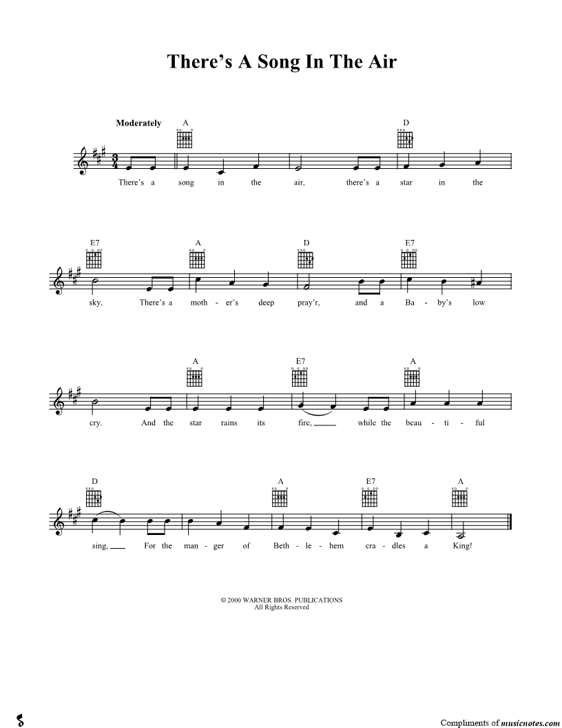 There's a song in the air, there's a star in the sky, There's a mother's deep pray'r, and a Baby's low cry. |