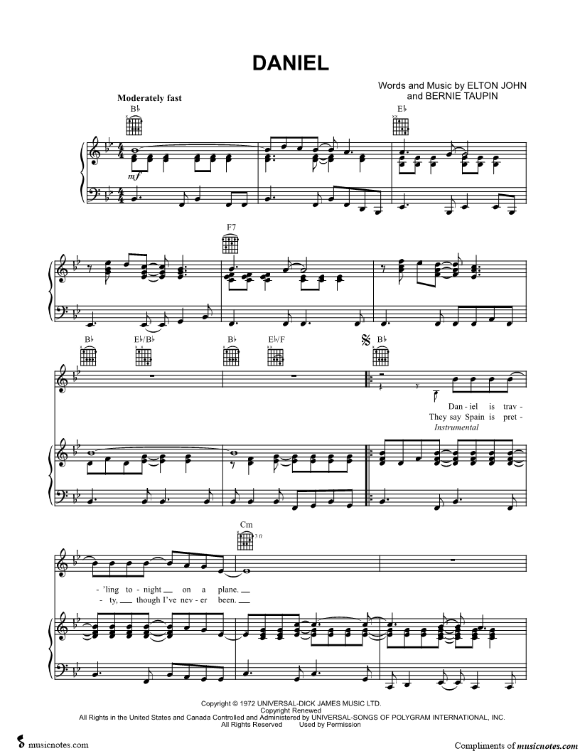 Daniel is trav'ling tonight on a plane I can see the red taillights heading for Spain Oh and I can see Daniel waving goodbye God it looks like Daniel Must be the clouds in my eyes Oh Daniel my brother you are older me |