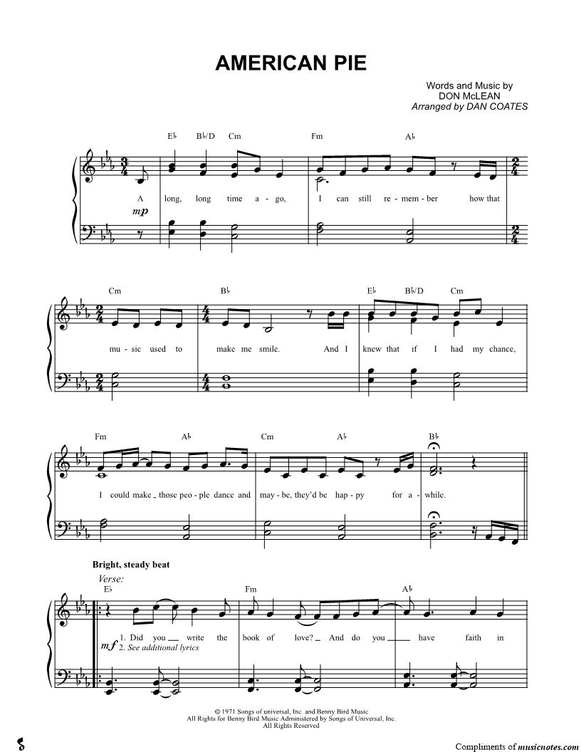 A long, long time ago I can still remember how that music used to make me smile And I knew if I had my chance that I could make those people dance and maybe they'd be happy for a while. |