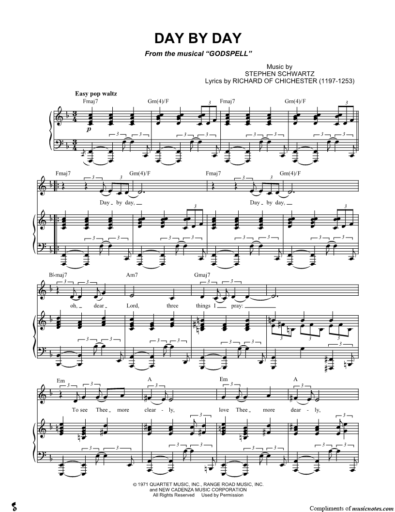 Day by day, Day by day, oh, dear Lord, three things I pray To see Thee more clearly, love Thee more dearly, follow Thee more nearly, day by day. |