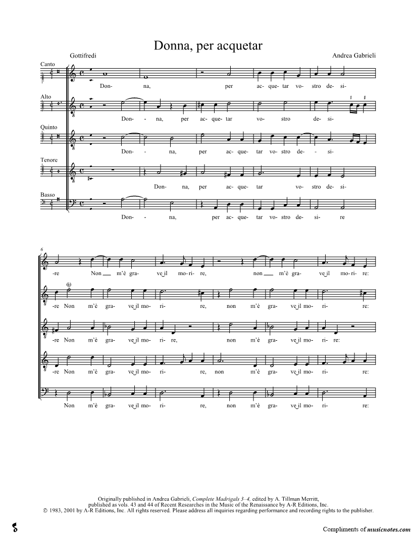 Donna, per acquetar vostro desire Non m'è grave il morire, Anzi il viver m'annoia. |