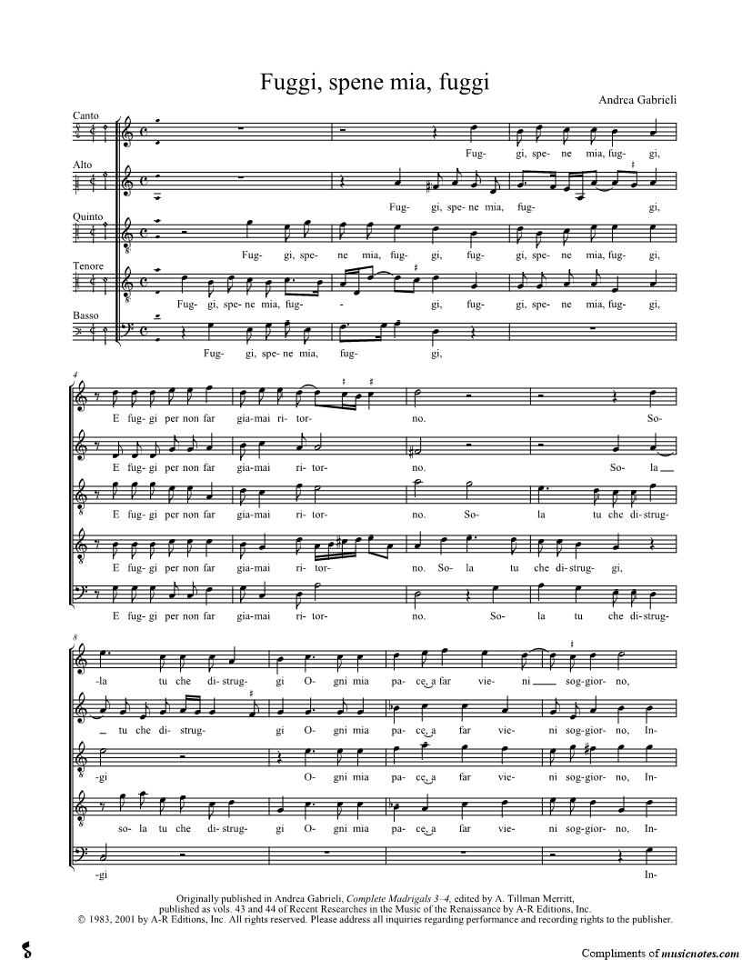 Alto Voice, range: A3-D5 Basso, range: G2-D4 Canto, range: D4-G5 Quinto, range: G3-A4 Tenore, range: D3-A4 Choir | |