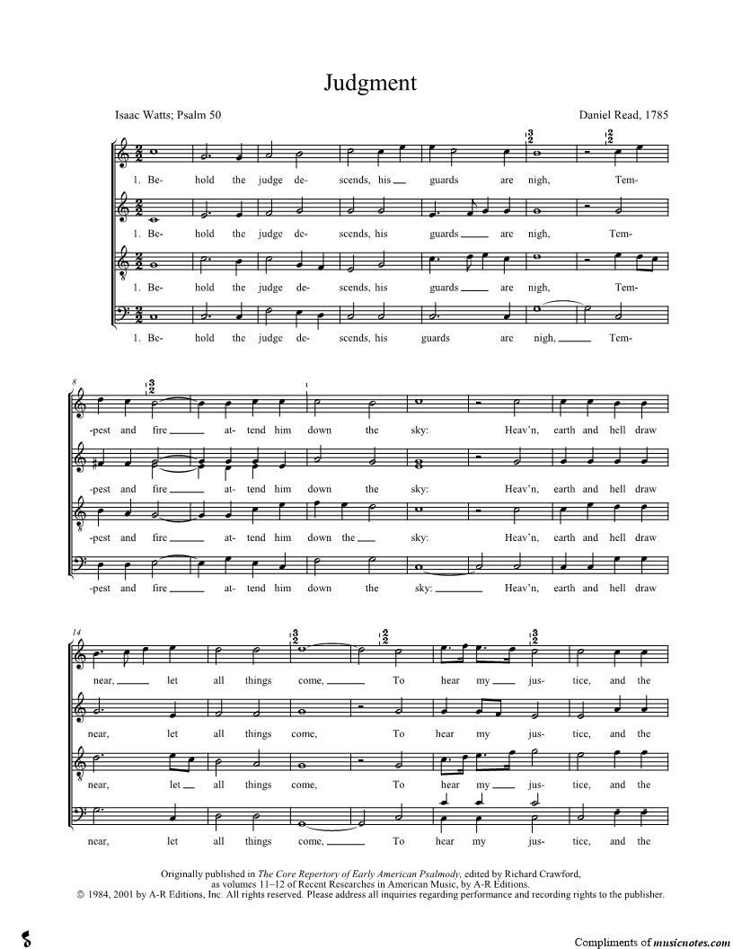 Behold the judge descends, his guards are nigh, Tempest and fire attend him down the sky Heav'n, earth and hell draw near, let all things come, To hear my justice, and the sinner's doom. |