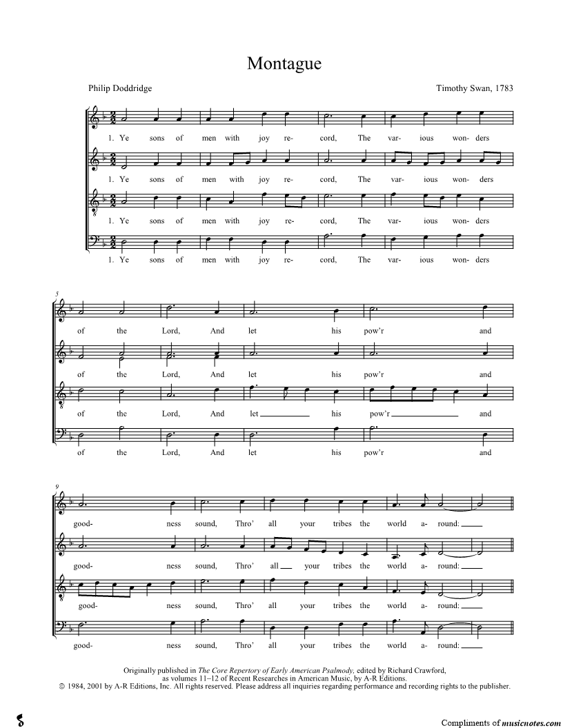 Ye sons of men with joy record, The various wonders of the Lord, And let his pow'r and goodness sound, Thro' all your tribes the world around Let the high heav'ns your songs invite, Those spacious fields of brilliant light, Where sun and moon and planets roll, And stars that glow from pole to pole. |