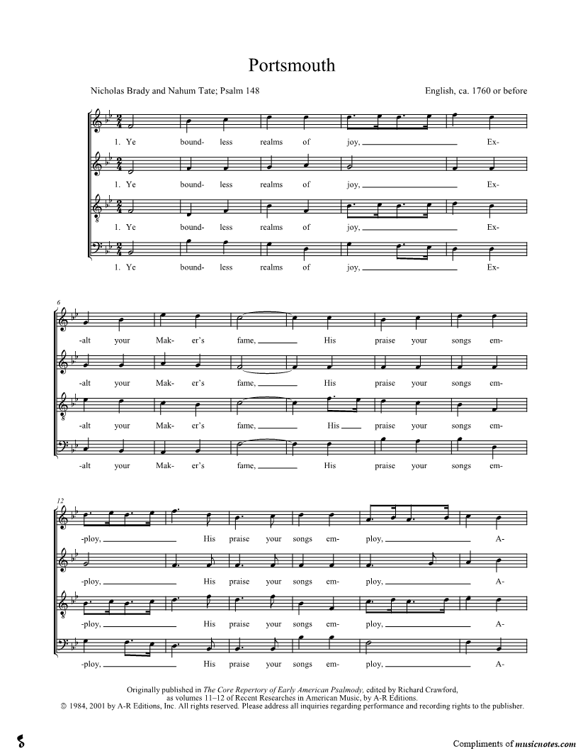 Ye boundless realms of joy, Exalt your Maker's fame, His praise your songs employ, Above the starry frame, Ye holy throng Of angels bright, In worlds of light, Begin the song. |