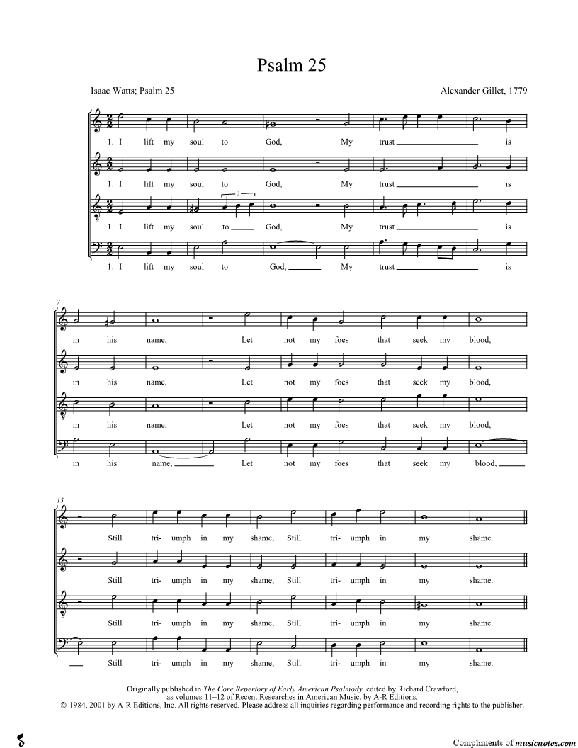 I lift my soul to God, My trust is in his name, Let not my foes that seek my blood, Still triumph in my shame. |