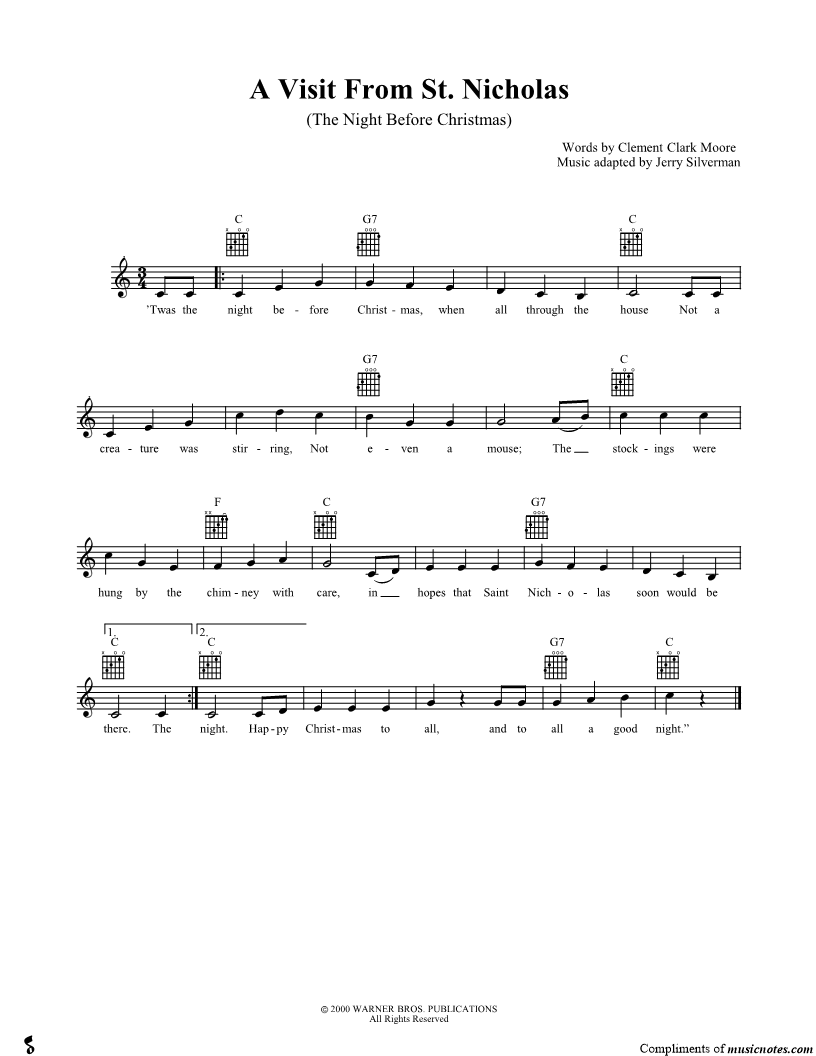 'Twas the night before Christmas, when all through the house Not a creature was stirring, Not even a mouse; The stockings were hung by the chimney with care, in hopes that Saint Nicholas soon would be there. |