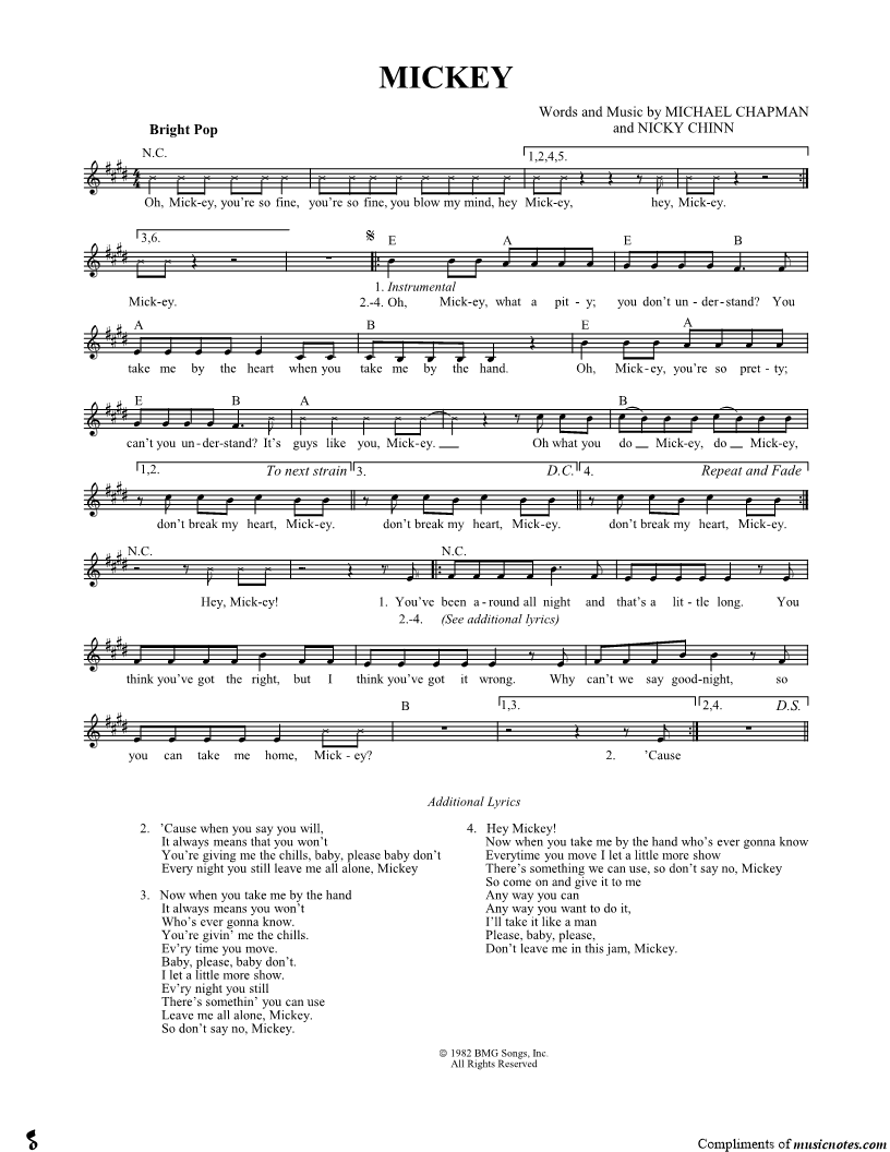 Oh, Mickey, you're so fine, you're so fine, you blow my mind, hey Mickey, hey, Mickey. |