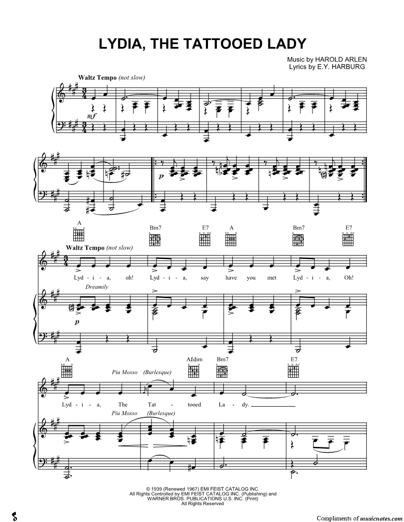 Lydia, oh! Lydia - say have you seen Lydia? Lydia, the Tattooed Lady. She has eyes that folks adore so. And a torso, even more so. Lydia oh Lydia, that encyclopedia - Oh! Lydia the Queen of Tattoo. On her back is the battle of Waterloo, beside it the wreck of the Hesperus too, And proudly above waves the red white and blue - you can learn a lot from Lydia! (Whistle) |