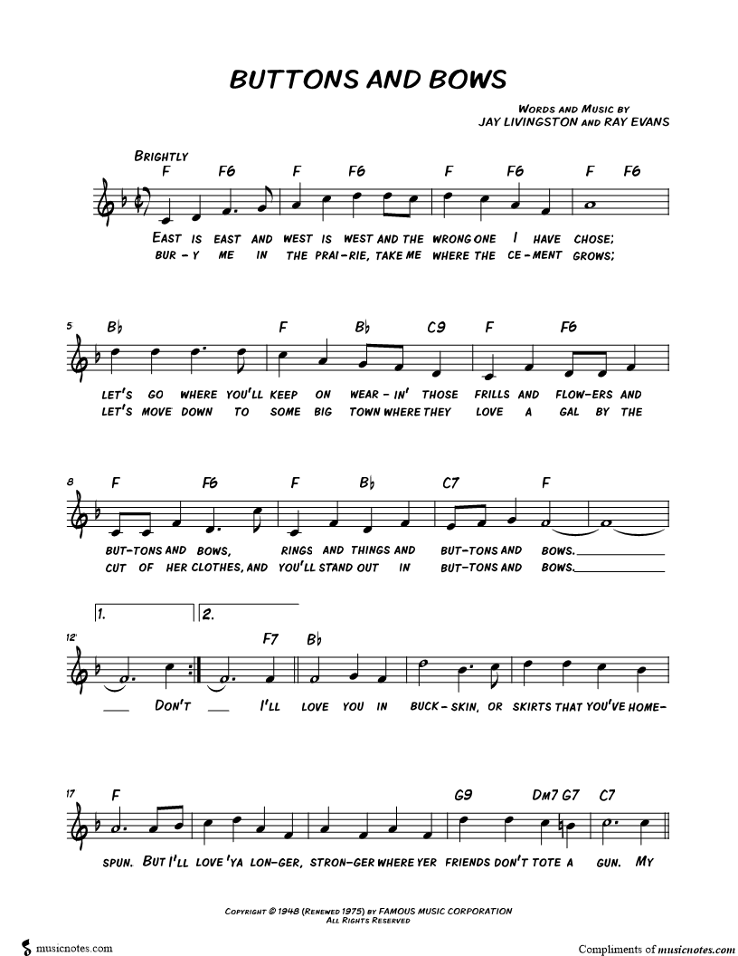 East is east and west is west and the wrong one I have chose; let's go where you'll keep on wearin' those frills and flowers and buttons and bows, rings and things and buttons and bows. |