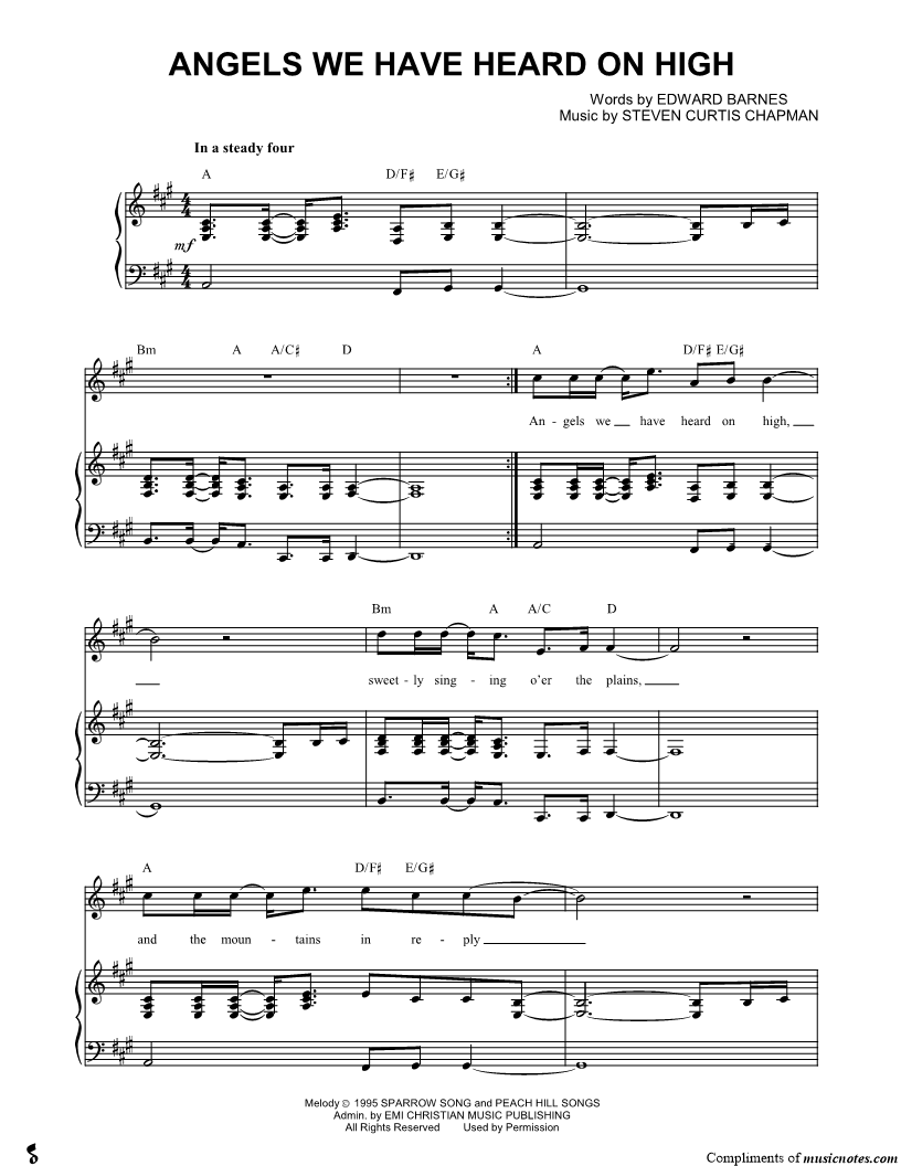 Angels we have on high, sweetly singing o'er the plains, and the mountains in reply echo at their joyous strains. |