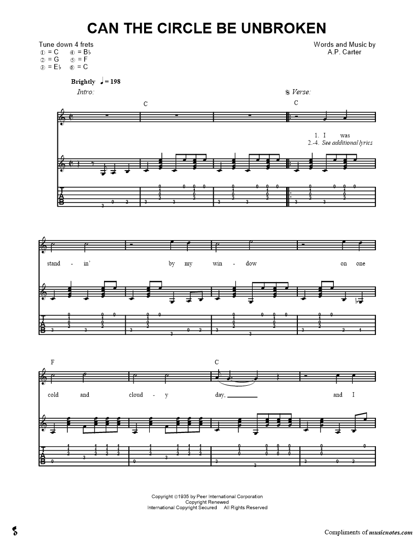 I was standin' by my window on one cold and cloudy day, and I saw the hearse come rollin' for to carry my mother a way Oh, can the cir cle be unbroken, bye and bye, |