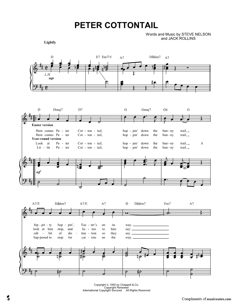 Here comes Peter Cottontail, hoppin' down the bunny trail, hippitty hoppin', |
