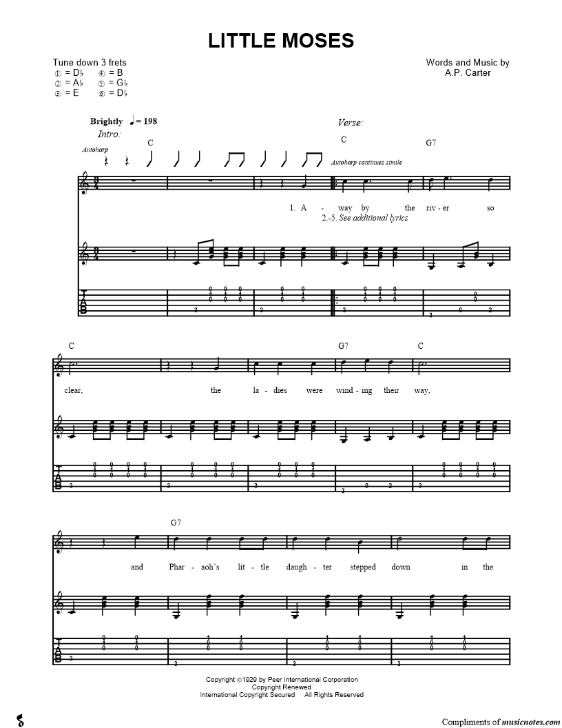 Away by the river so clear, the ladies were winding their way and Pharaoh's little daughter stepped down in the ter to bathe in the cool of the day Before it was dark, she opened the ark and found the sweet infant was |