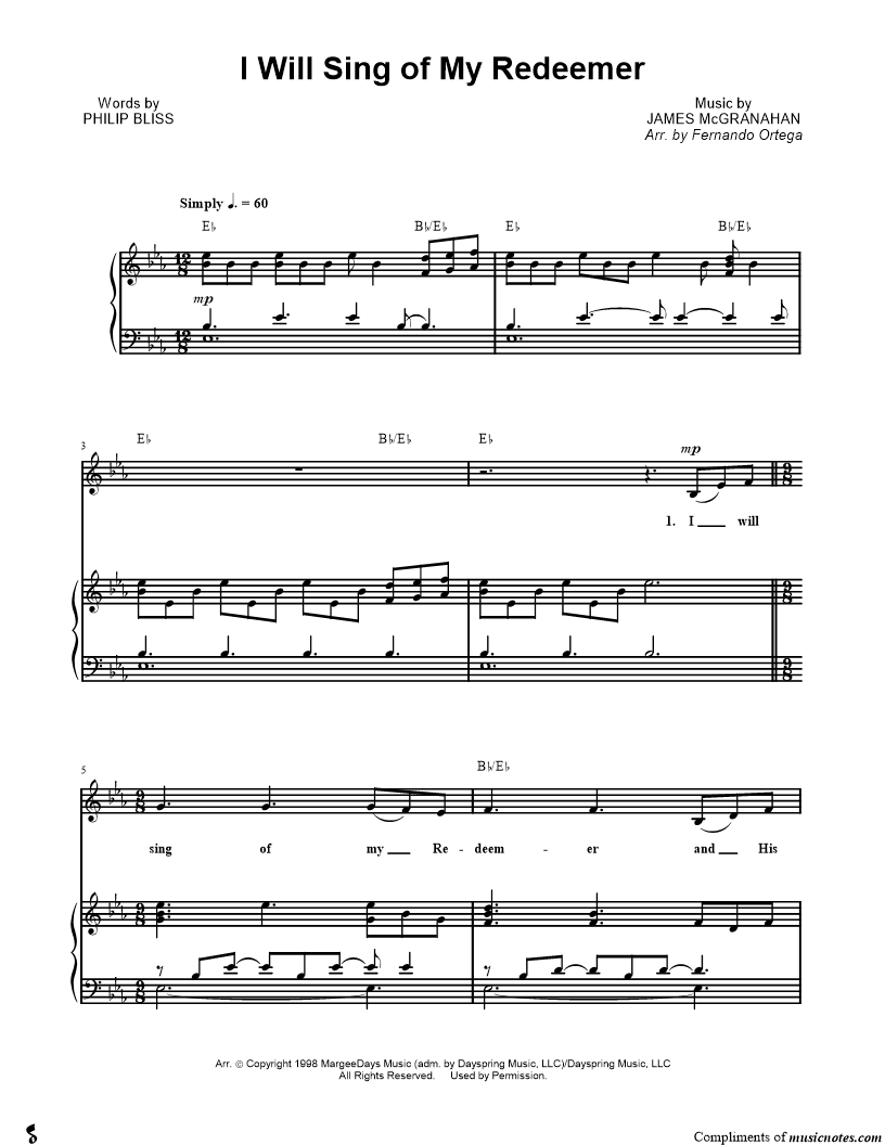 I will sing of my Redeemer and His wondrous love to me; on the cruel cross He suffered from the curse to set me free. |