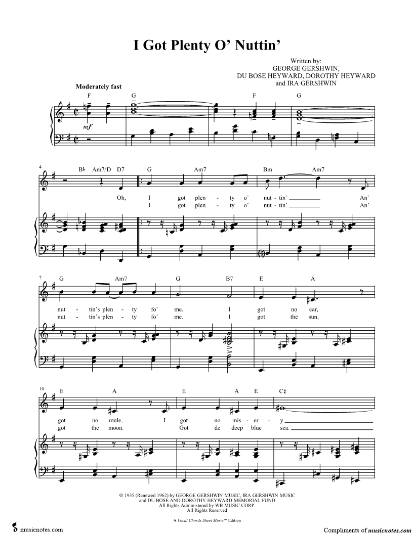 Oh, I got plenty o' nuttin' An' nuttin's plenty fo' me. |