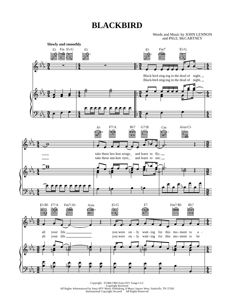 Blackbird singing in the dead of night, take these broken wings and learn to fly; all your life you were only waiting for this moment to arise. |