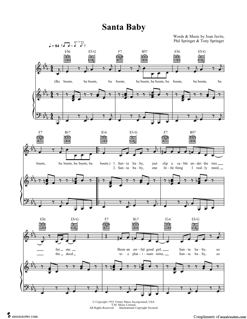 (Ba boom, ba boom, ba boom, ba boom, ba boom, ba boom, ba boom, ba boom, ba boom, ba boom, ba boom.) Santa baby, just slip a sable under the tree for me. |