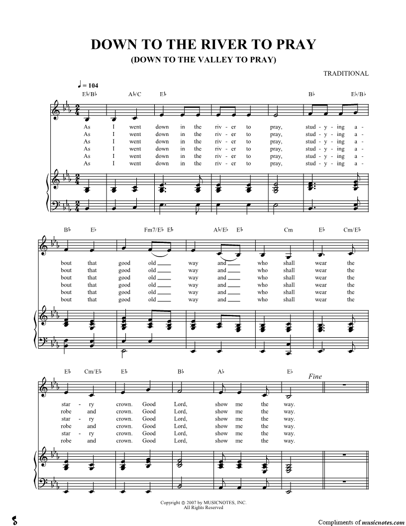 As I went down in the river to pray, studying about that good old way and who shall wear the starry crown. |