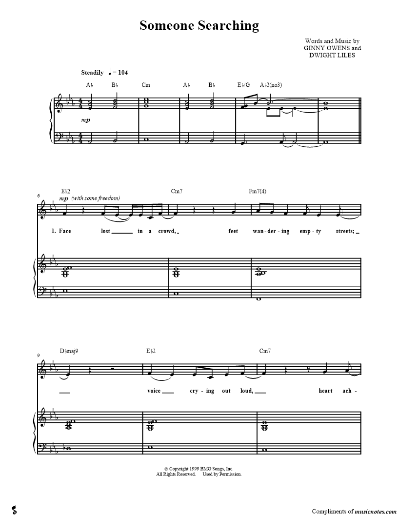 Face lost in a crowd, feet wandering empty streets; voice crying out loud, heart achin' with ev'ry beat. |
