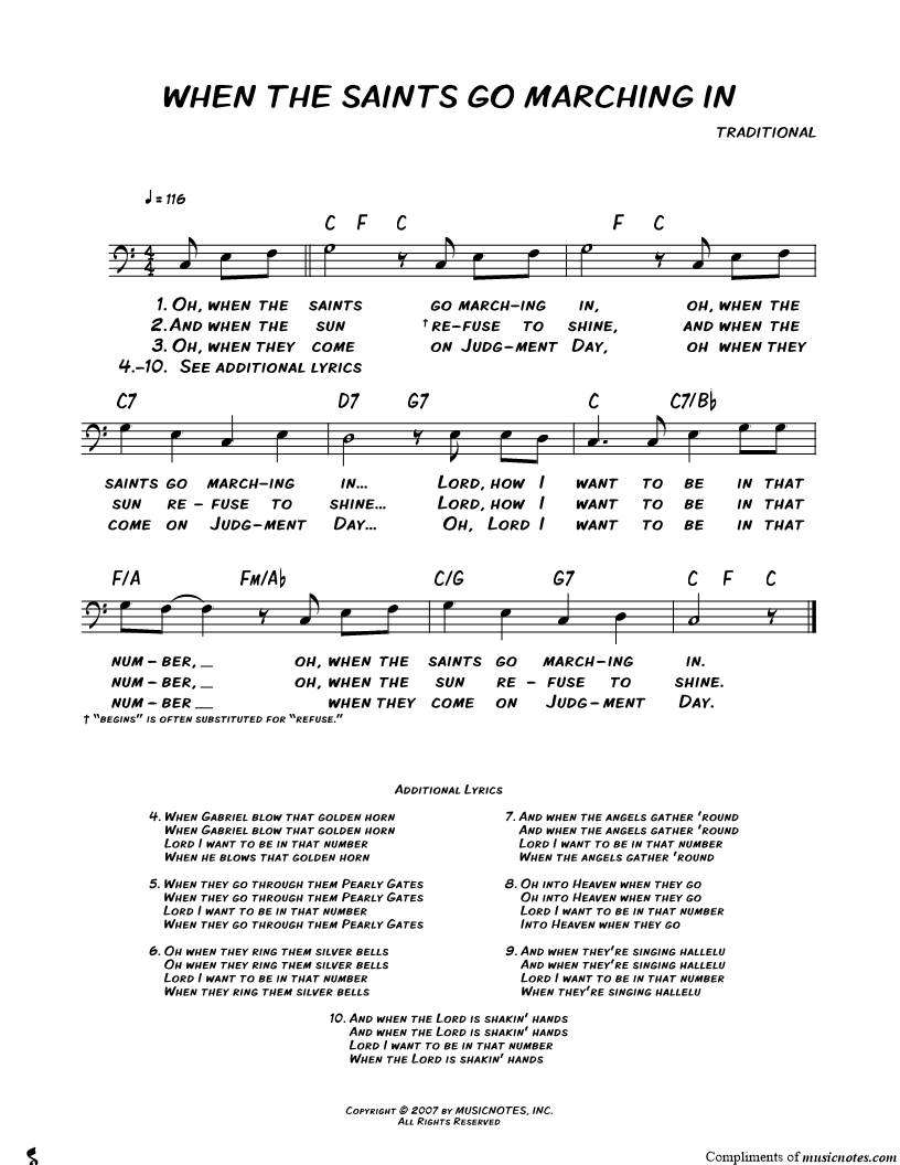 Oh, when the saints go marching in, oh, when the saints go marching in... |