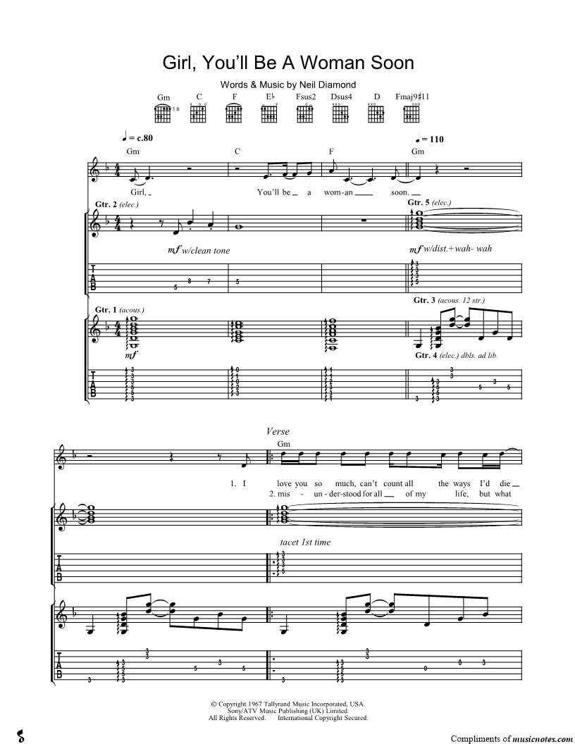 Voice, range: Bb3-D5 Guitar 1, range: D4-G5 Guitar 2, range: F3-G5 Guitar 3, range: F3-G5 | |