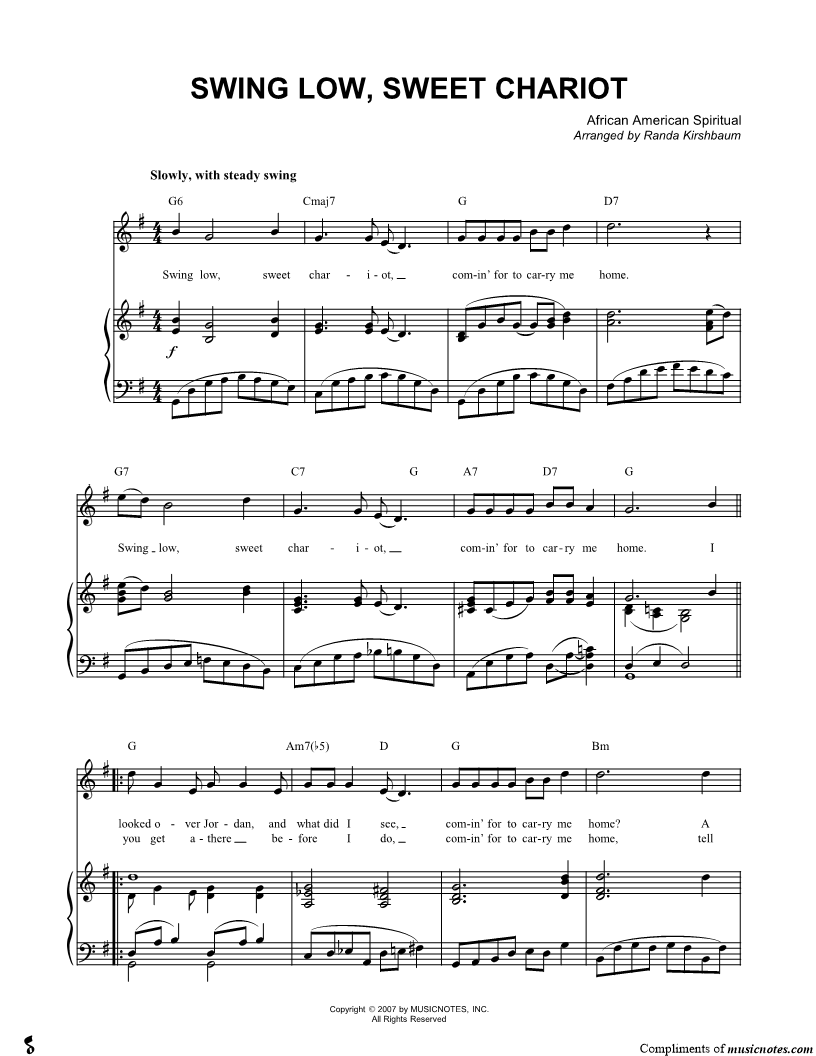 Swing low, sweet chariot, comin' for to carry me home. |