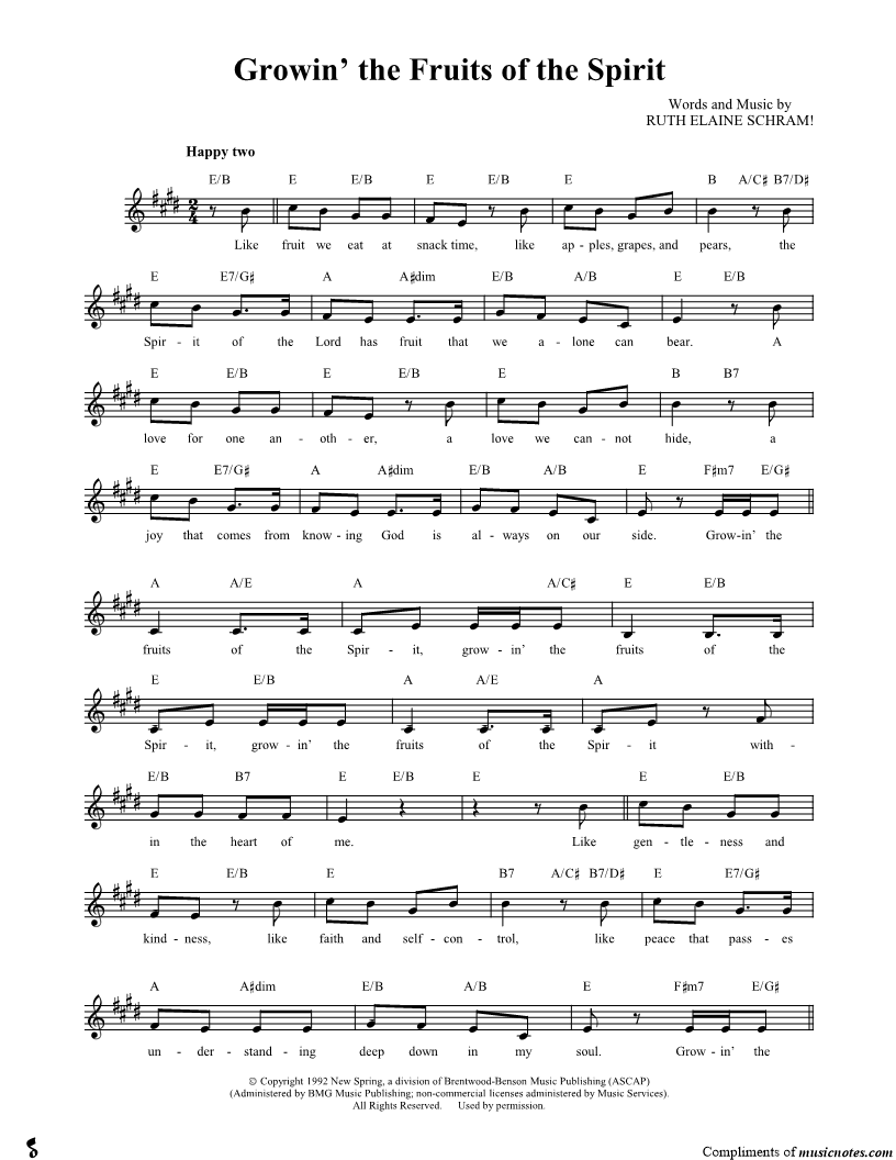 Like fruit we eat at snack time, like apples, grapes, and pears, the Spirit of the Lord has fruit that we alone can bear. |