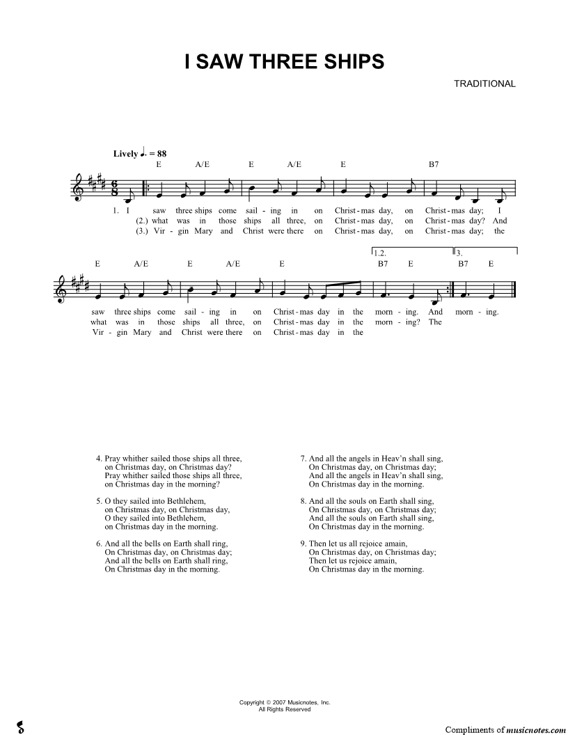 I saw three ships come sailing in on Christmas day, on Christmas day; |