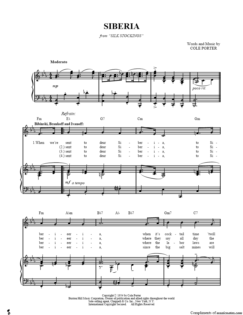 When we're sent to dear Siberia, to Siberieeria, when it's cocktail time 'twill be so nice just to know you'll not have to phone for ice, |
