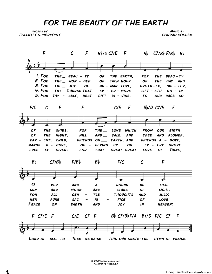 For the beauty of the earth, for the beauty of the skies, for the love which from our birth Over and around us lies Lord of all, |