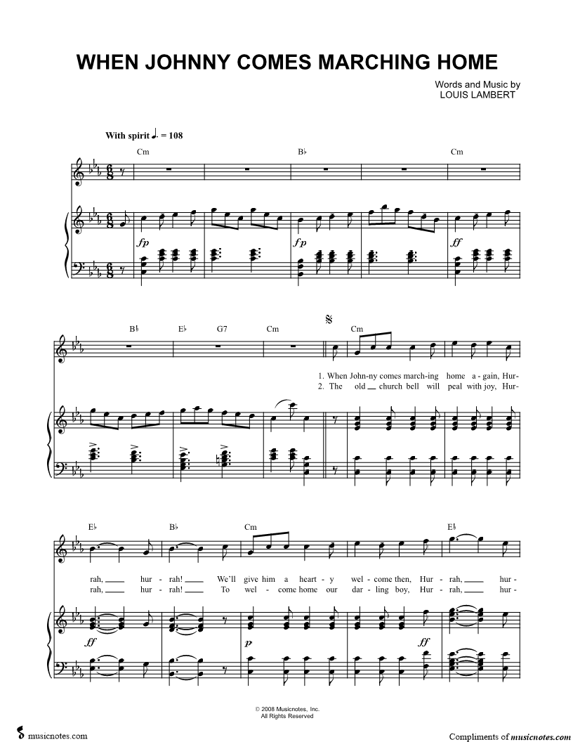 When Johnny comes marching home again, Hurrah, hurrah! |