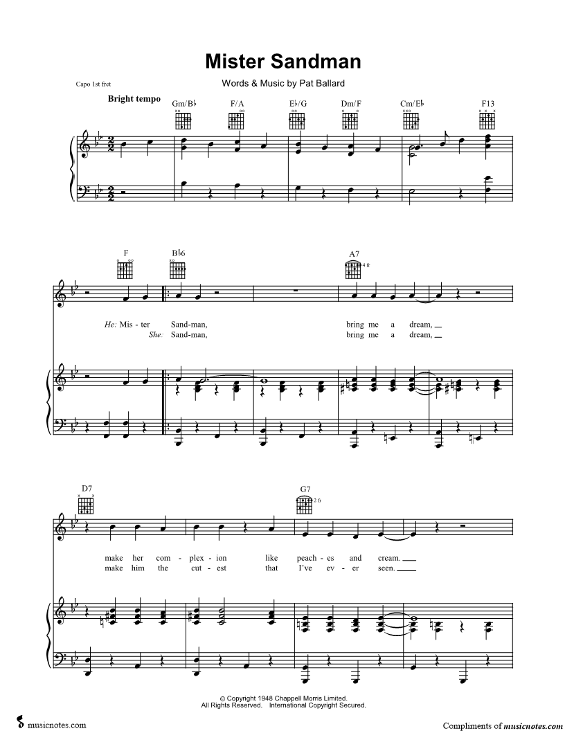 Mister Sandman, bring me a dream, make her complexion like peaches and cream. |