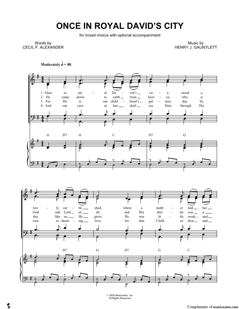 Once in royal David's city, stood a lowly cattle shed, where a mother laid her Baby, in a manger for His bed Mary was that Mother mild, |
