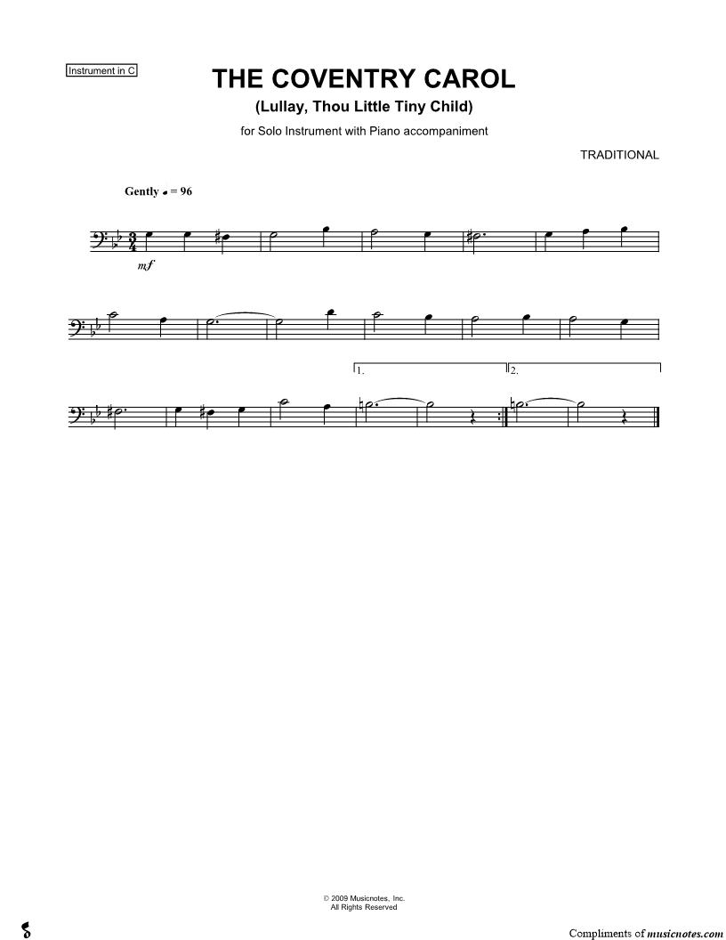 The Coventry Carol - Bass Clef Instrument & Piano Lullay, Thou Little Tiny Child