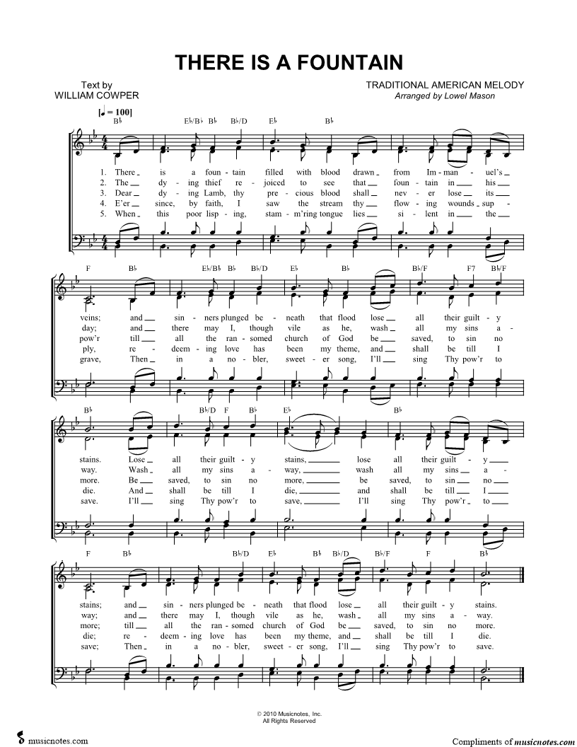 There is a fountain filled with blood drawn from Immanuel's veins; and sinners plunged beneath that flood lose all their guilty stains. |
