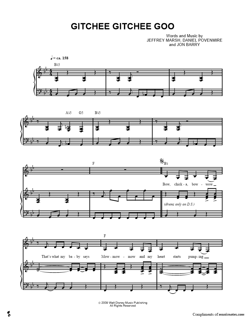 Bow, chicka, bowwow That's what my baby says Mowmowmow and my heart starts pumping Chickachickachoo wah never gonna stop Gitchee, gitchee, goo means that I love you My baby's got her own way of talking whenever she say |