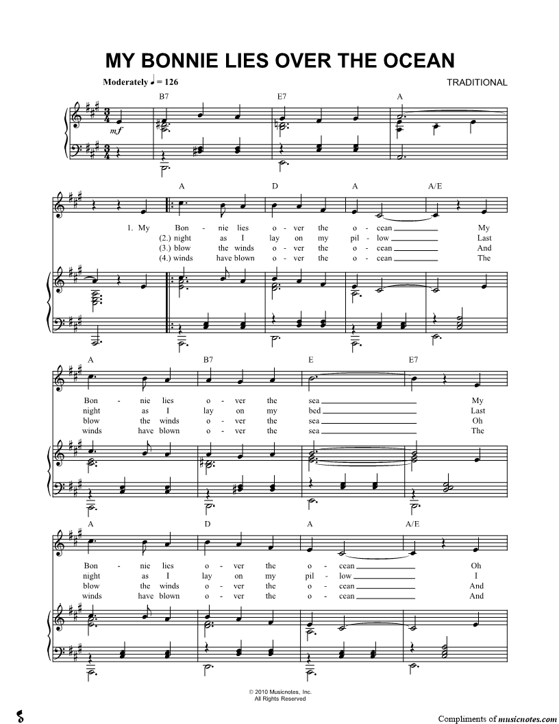 My Bonnie lies over the ocean My Bonnie lies over the sea My Bonnie lies over the ocean Oh bring back my Bonnie to me. |
