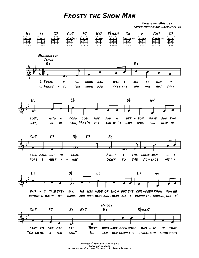 Frosty, the snow man was a jolly happy soul, with a corn cob pipe and a button nose and two eyes made out of coal. |