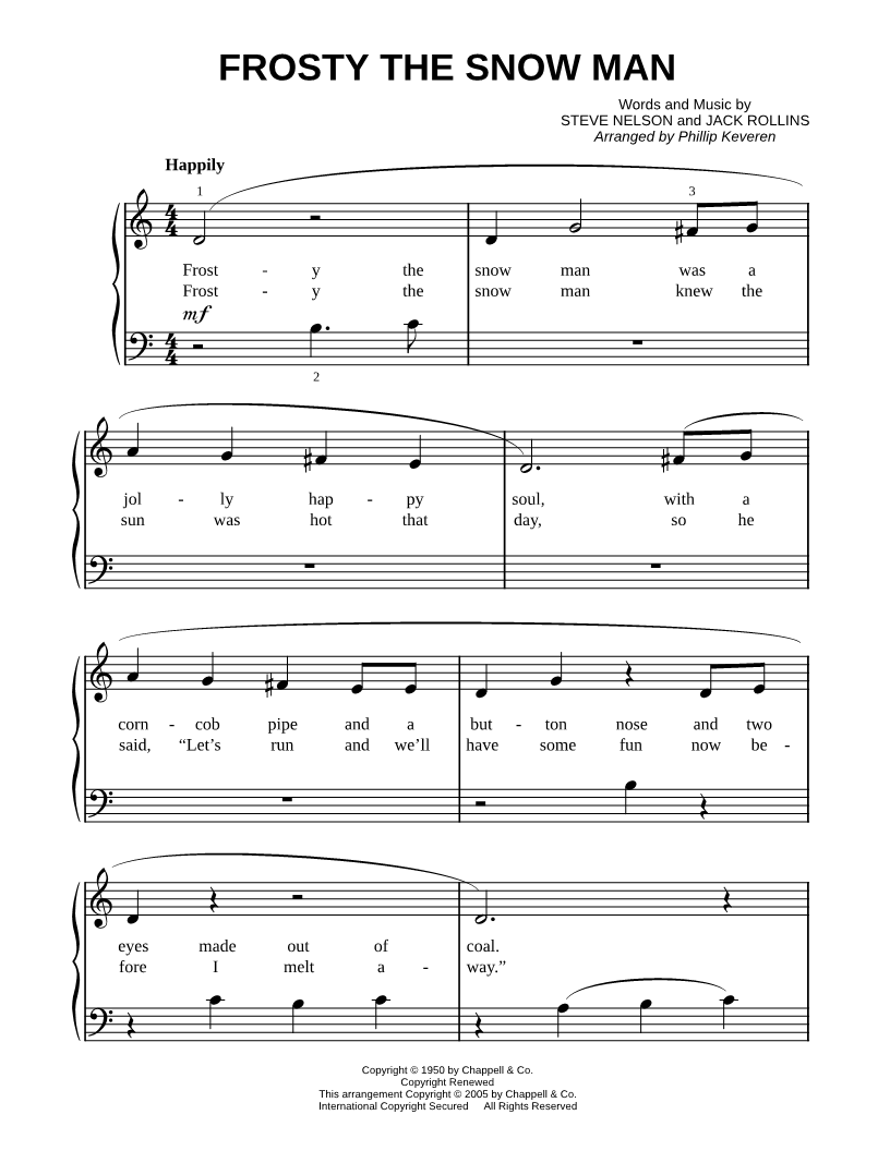 Frosty the snow man was a jolly happy soul, with a corncob pipe and a button nose and two eyes made out of coal. |